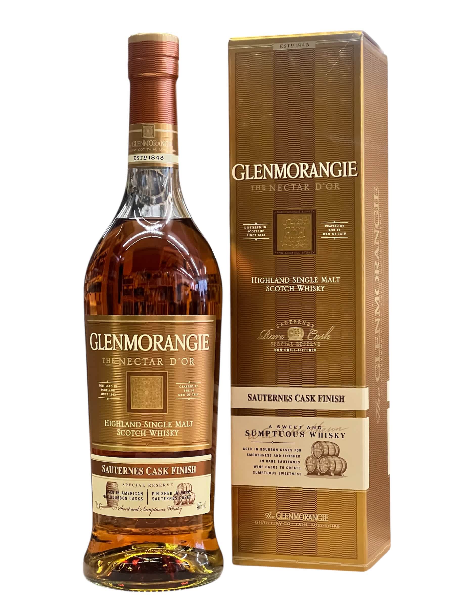 GLENMORANGIE DISTILLERY Nectar D'or The Nectar D’Or is Glenmorangie’s delicious, complex base spirit that, after a minimum of 10 years in ex-bourbon casks, is then extra matured in specially hand selected Sauternes wine barriques. This makes it rich and sumptuous with a heady, luscious spectrum of aromas of plump juicy sultanas, dates, warming ginger, coconut and nutmeg. Non chill-filtered.